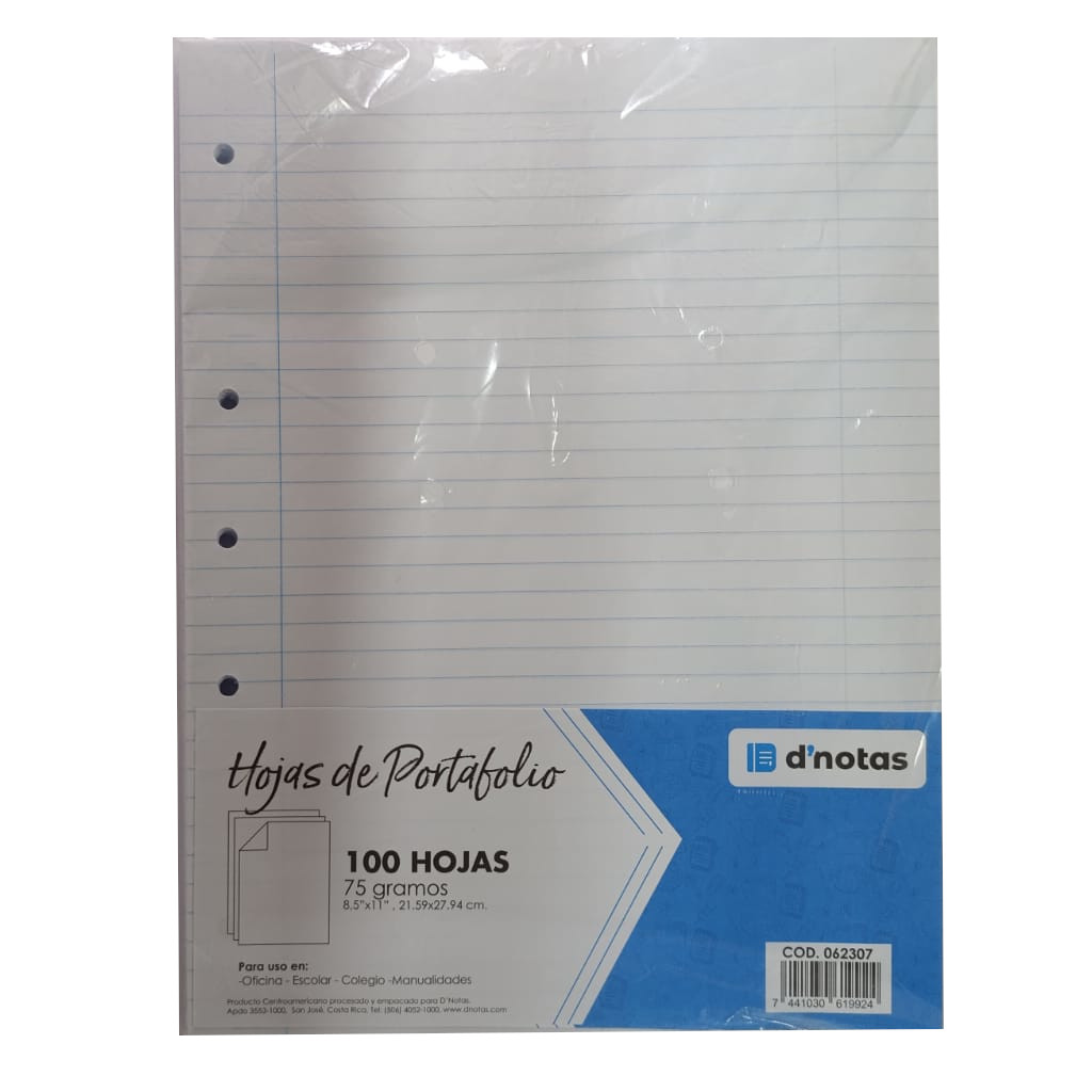 CODIGO: 062307 Hojas con 5 perforaciones de 6 mm de distancia entre perforaciones: hoja: 8.5 x 11 pulgadas Empaque: 100 hojas carta en una bolsa de polipropileno (801183) con portada triangulr DNotas.
